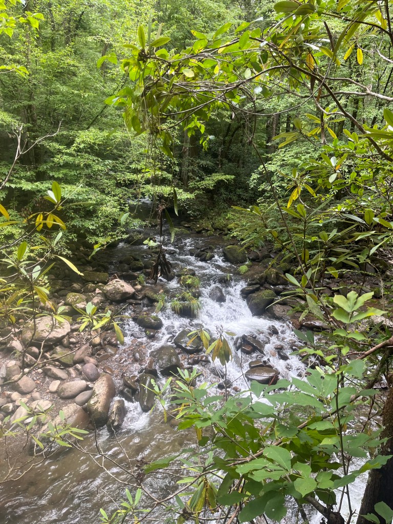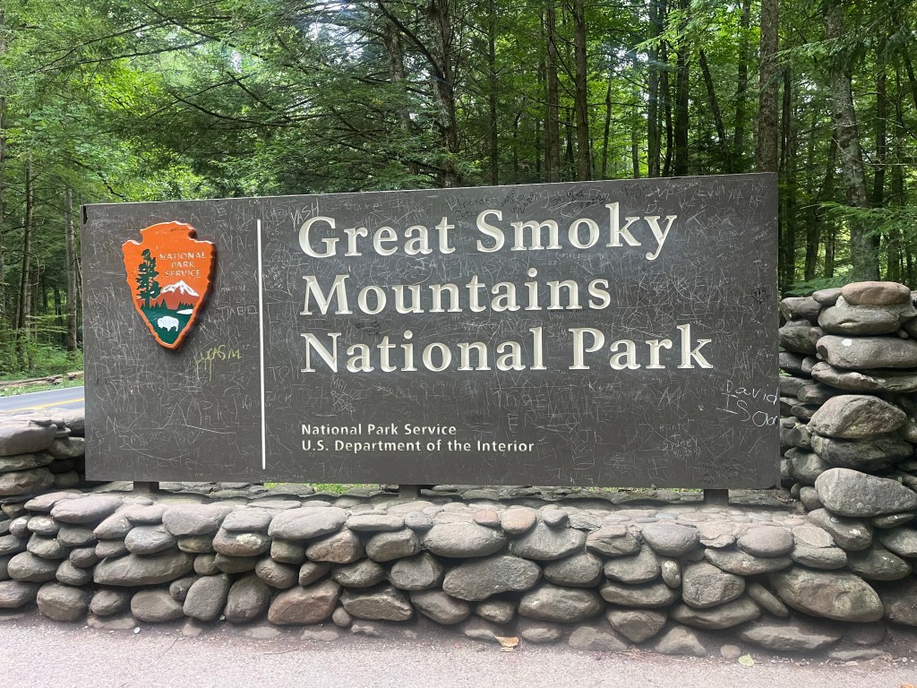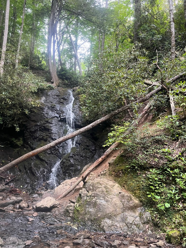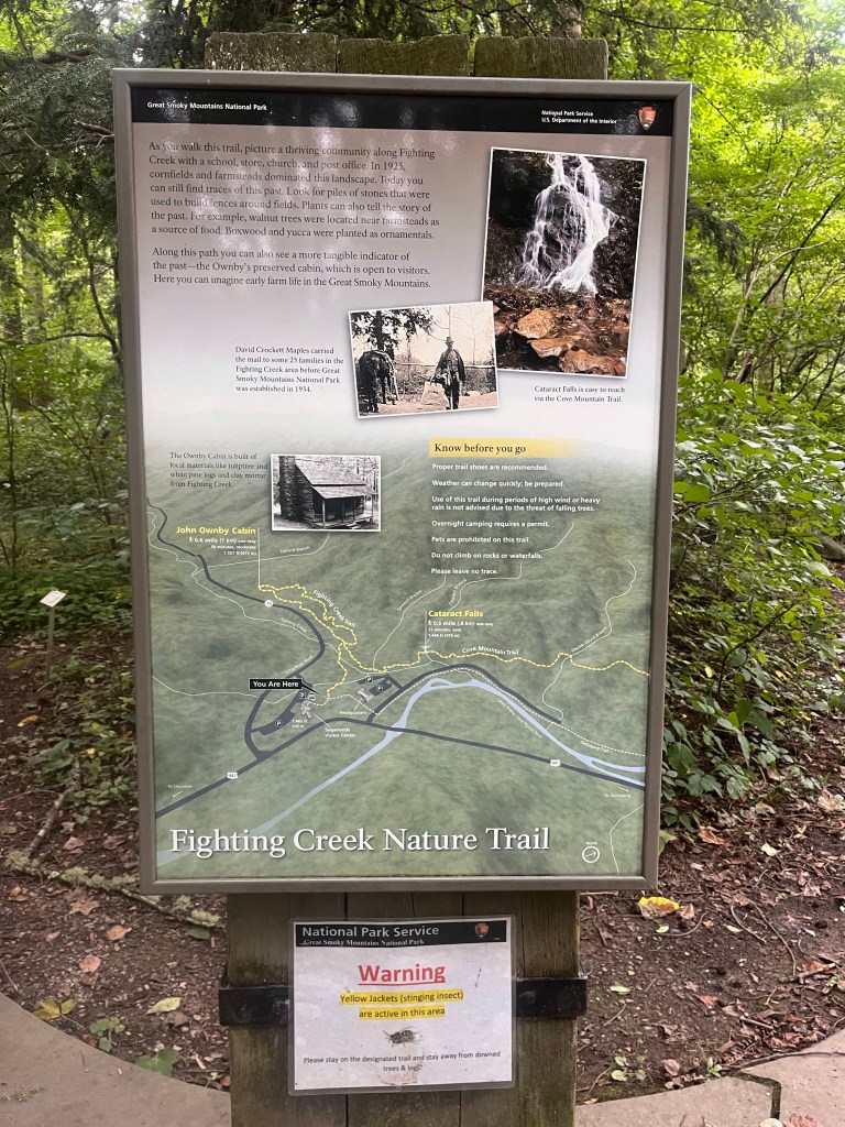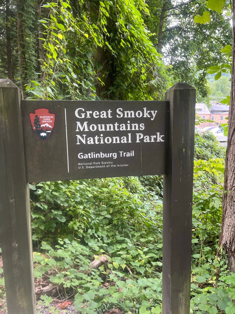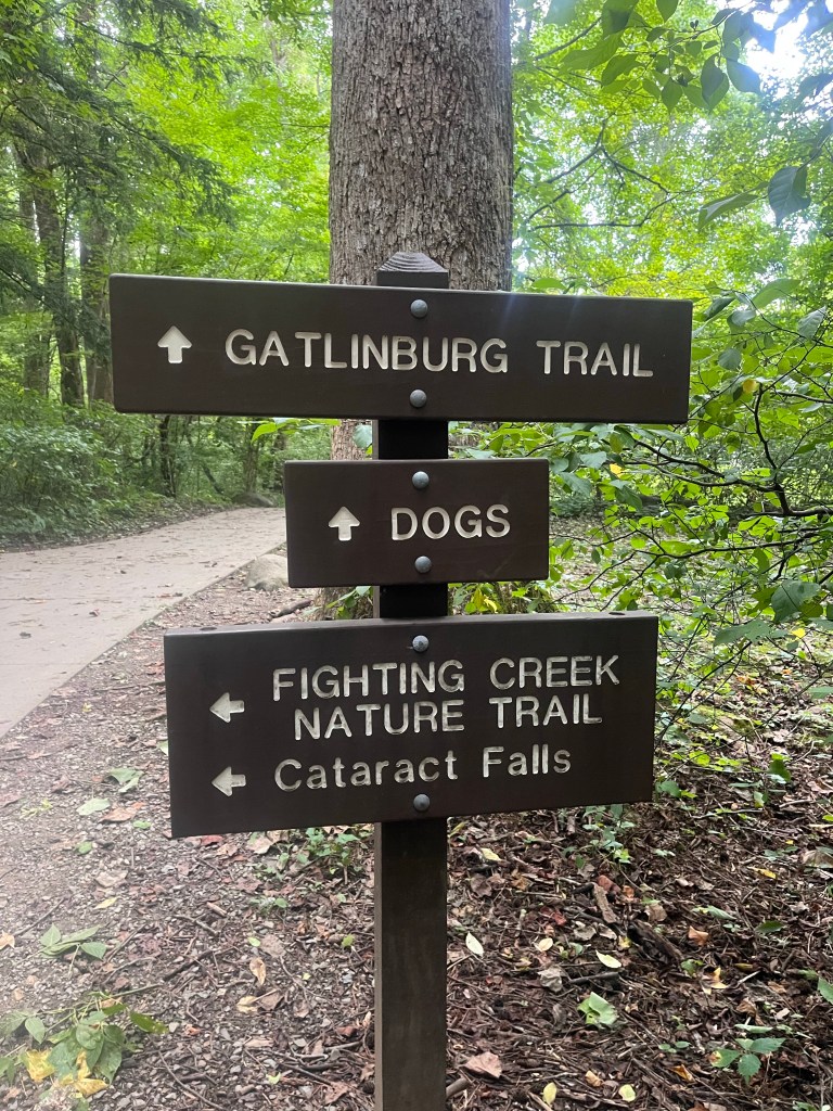 This is the first. The first of hopefully many (more) trails and adventures. I was encouraged to do this blog by a friend, and after much consideration, decided to go for it. I love hiking, and I love writing, and I love new adventures. These are not, by any means, the only trails I’ve hiked. It’s possible I’ll go back and write on some of my previous hikes, but for now, we’re going to start recent. MDH (that’s My Dear Husband) and I took a four-day trip to Great Smoky Mountains National Park as a short vacation before the school year got into full swing. We stayed in Gatlinburg and spent a few days roaming the park, hiking the trails, and enjoying the beauty of the area. I had never been to GSMNP before, and I quickly fell in love with the amazingness of it. We arrived in Gatlinburg around 4pm and decided to do a quick pre-dinner hike from our hotel in Gatlinburg to Cataract Falls, via the Gatlinburg Trail. That being said, we did NOT take the “typical” route that starts at the Sugarlands Visitors Center. We did indeed get to the Visitors Center, but alas, they were closed. The Gatlinburg Trail starts kind of at the “end” of Gatlinburg, and quickly melts into a scenic trail (very wide, by the way) with the sound of traffic roaring up Newfound Gap Road. The West Prong of the Little Pigeon River, however, is usually louder. And after all the rain, it was moving quickly. The trail itself is crushed rock and pretty easy, although there’s a bit of more rugged trail once heading up to the Falls. The Gatlinburg side of the trail, close to the town, is pretty easy. We stopped for a photo by the National Park Entrance Sign and then continued on our way. Once we hit the Visitors Center area, we stepped off the Gatlinburg Trail and hit up the Cove Mountain Trail the rest of the way to Cataract Falls. Honestly, the trail itself was not very hard. There was a slight decent down to the Falls from where we had been, and then the slight climb out on the way back. It was a pretty chill hike, with minimal bugs or elevation, and the perfect pre-dinner hike. Below are several photos from our hike.
